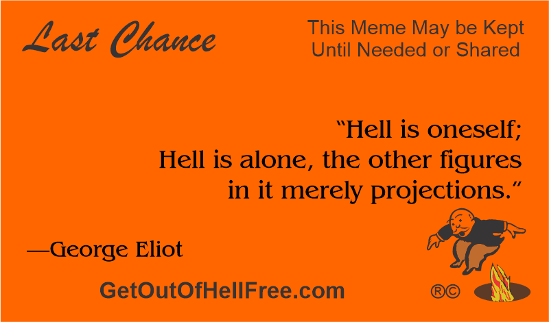 328: George Eliot Posted November 17, 2025February 1, 2026 in Categories Meme “Hell is oneself; Hell is alone, the other figures in it merely projections.” —George Eliot You have the power to change it.