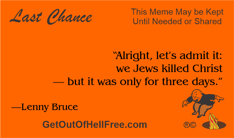 329: Lenny Bruce Posted November 17, 2025February 8, 2026 in Categories Meme “Alright, let’s admit it, we Jews killed Christ — but it was only for three days.” —Lenny Bruce So really, it hardly counts.