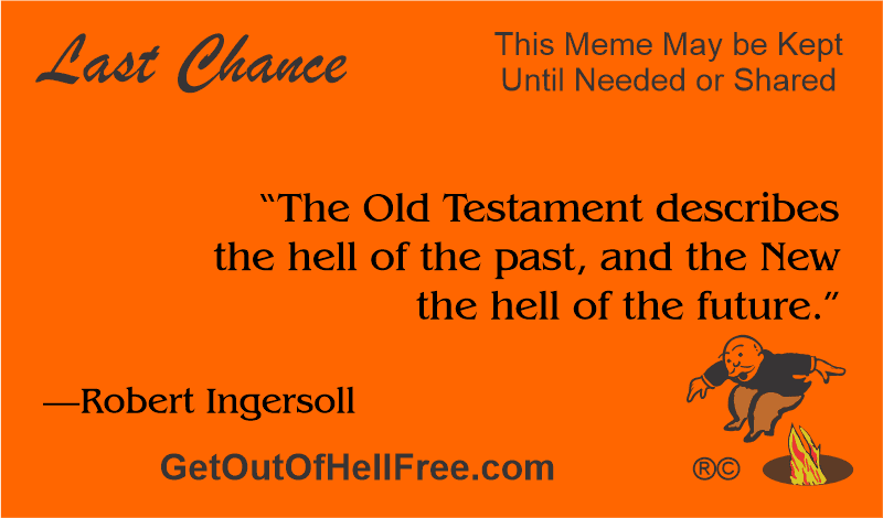 330: Robert Ingersoll Posted November 17, 2025February 15, 2026 in Categories Meme “The Old Testament describes the hell of the past, and the New the hell of the future.” —Robert Ingersoll As the contemporaries try to convince us we’re all there now.