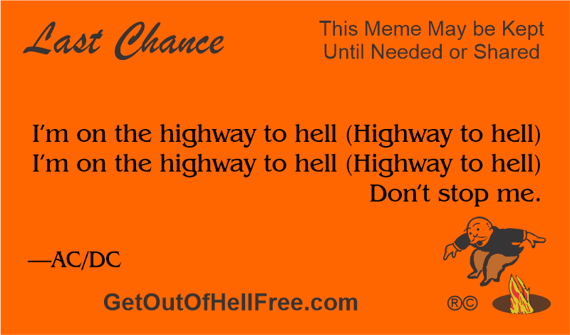 321: AC/DC Posted November 17, 2025December 14, 2025 in Categories Meme “I’m on the highway to hell (Highway to hell)/I’m on the highway to hell (Highway to hell) / Don’t stop me.” —AC/DC There are exits every 6.66 miles.