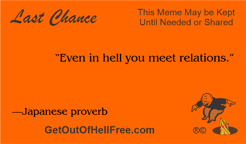 153: Japanese proverb Posted November 18, 2025September 25, 2022 in Categories Meme “Even in hell you meet relations.” —Japanese proverb Especially in hell!